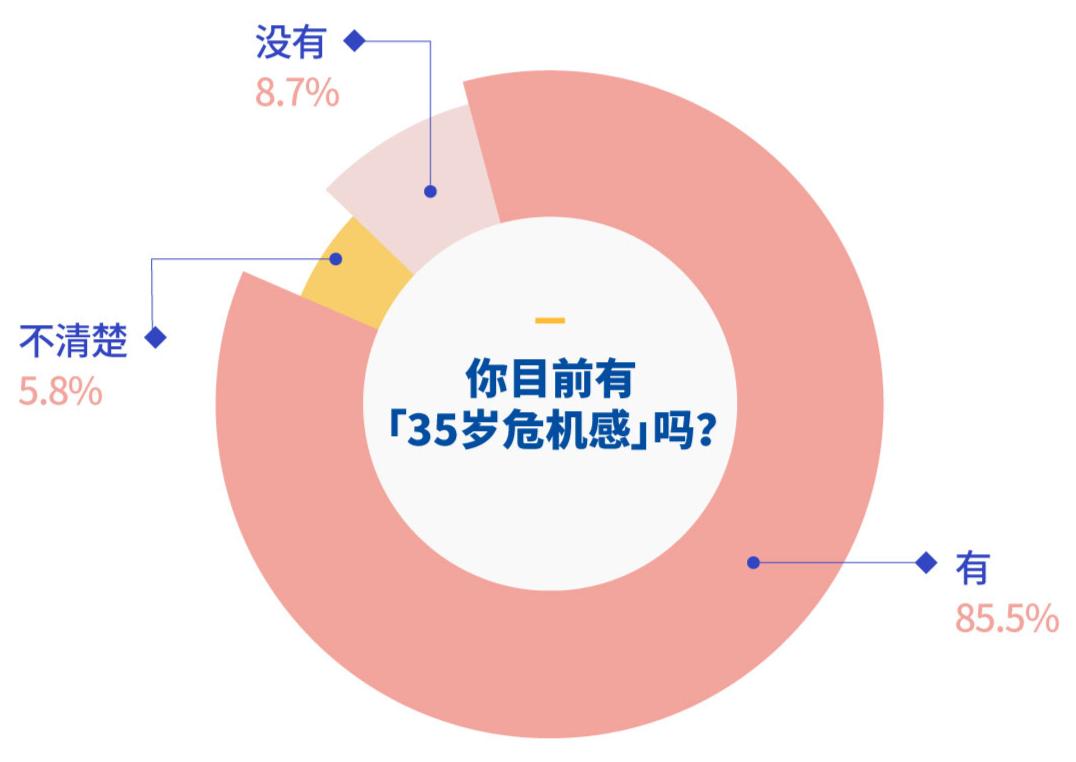 面对35岁这一「人生分水岭」,这届职场人依旧非常焦虑。调查显示,85.5%的受访者表示有「35岁危机感」,仅有8.7%的受访者没有。