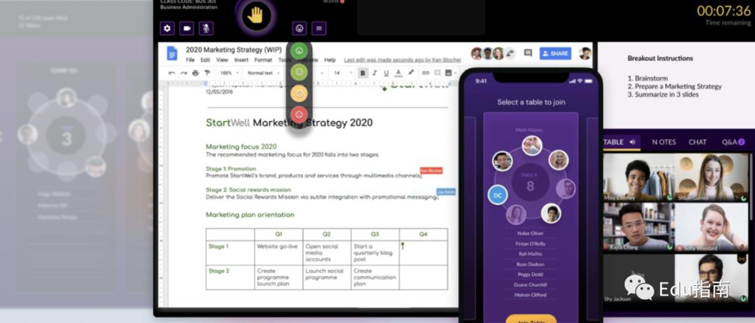 其他还包括:灵活的表格组、学生笔记、问答、聊天功能以及学生-教师反馈循环等。在上课期间和下课后,学生通过小组等形式,与他们的同龄人和他们的老师互动,以及在课程之间实时地协作。
