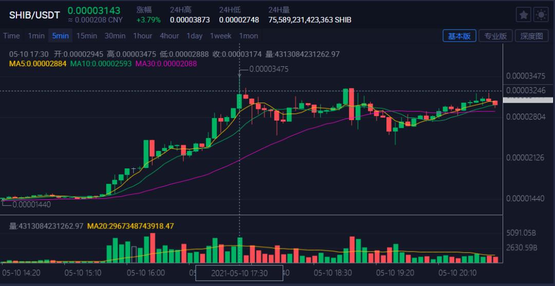 因有狗狗币一飞冲天的神话所在,马斯克在币圈的一举一动都牵动着每个人的心弦。网友们纷纷猜测马斯克是不是有投资柴犬币的意向,随后币圈引起狂欢。因为SHIBA INU在日文里被称作柴犬,币圈的人又亲切的称其“屎币”,SHIB突然爆火。