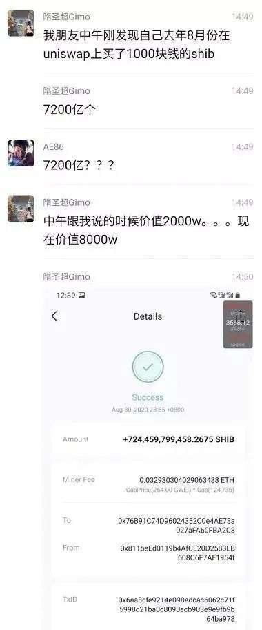一位微信名为隋圣超Gimo的网友在群里晒出了朋友去年8月份买的1000元屎币,因为单价低,直接拿了超7200亿个币,而在10号中午,手里的屎币就已经暴涨到了2000万,等到屎币冲上币安时,2000万又翻成了8000万,直接赚了半个“一爽”。