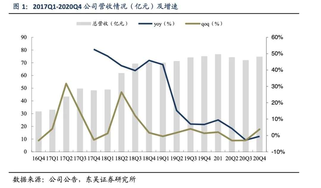 爱奇艺2017年Q1-2020年Q4营收情况(亿元)及增速