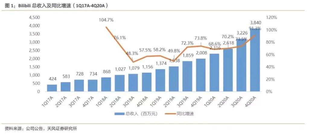 Bilibili2017年Q1-2020年Q4营收情况(百万元)及同比增速