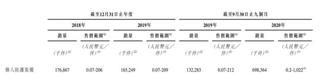 反映在英科医疗的财报里,就是销量与毛利率的上涨。招股说明书显示,2018至2019年,英科医疗的毛利率始终稳定在20%左右,个人防护装备的售价范围在0.07-209元/件,销量约在1.7-1.8亿件;但在2020年前三季度,毛利率猛增至66.7%,售价范围也增至0.2-1022元/件,翻了几倍不止,销量达到7亿件。