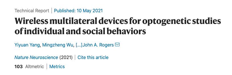 论文通讯作者、西北大学生物电子学先驱John A. Rogers说:「这篇论文代表了我们第一次能够在给定的环境下,通过对多个设备同时进行完全独立的数字控制,实现光遗传学的无线、无电池植入。单个动物的大脑活动是有趣的,但是超越个体,进而研究复杂的、具有社交互动的群体,是神经科学最重要、最令人兴奋的前沿领域之一。我们现在有了技术,可以研究这些群体中个体之间的联系是如何形成和断开的,以及社会等级是如何从这些互动中产生的。」