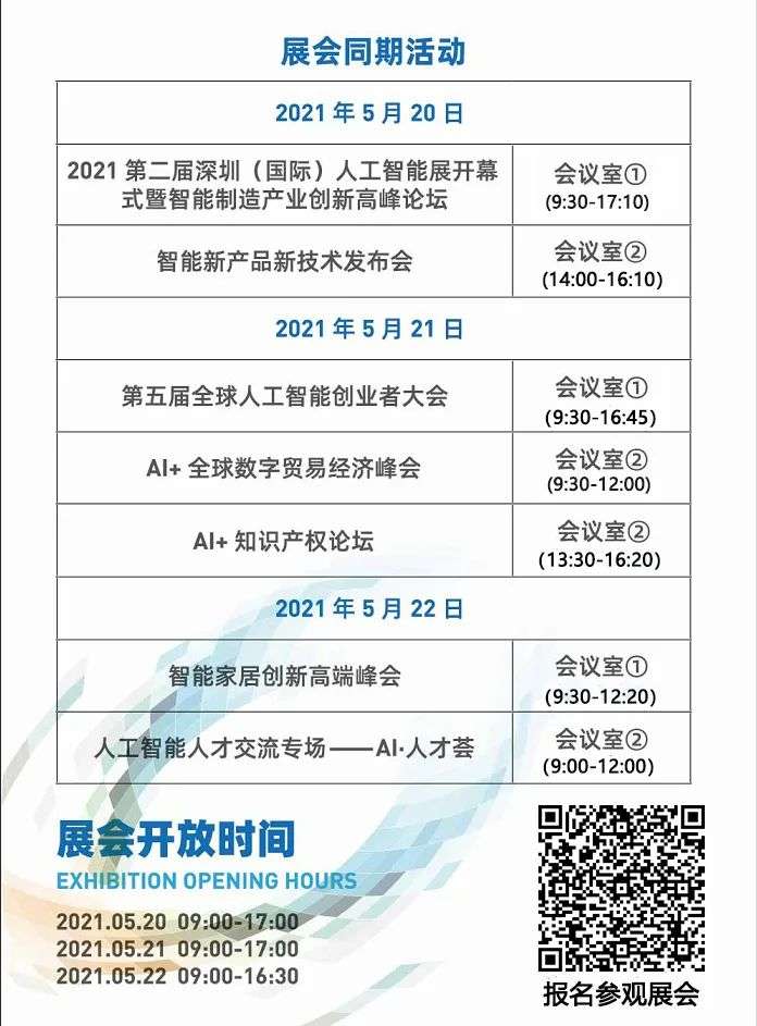 目前,展会的观众报名预登记系统已经正式上线,想要参观展会的观众只要动动手,填写一下信息就可以登记报名参观展会了。到时只要拿出二维码就可以实现快速进馆,免去排长队的麻烦,非常方便。第二届深圳(国际)人工智能展将于2021年5月20日-22日在深圳会展中心(福田)6号馆举办,欢迎大家报名参观展会,一起见证这场全球性的大型人工智能专业展览会。