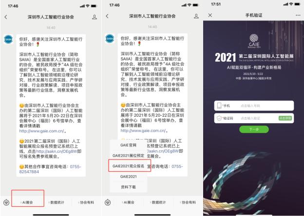 △1. 关注“深圳市人工智能行业协会(saiia2017)”公众号,点击栏目“AI展会”,再点击子栏目“GAIE2021观众报名”,然后根据要求填写信息即可完成报名登记。
