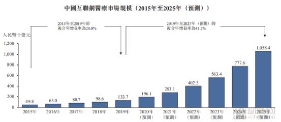 招股书引用的数据显示,我国互联网医疗行业2019年的市场规模为1337亿元,预计2025年市场规模将达到1万亿以上,年复合增长率为41.2%。