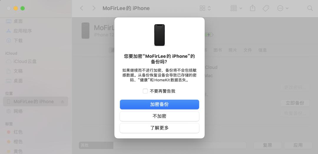 需要注意的是,如果你使用的是苹果电脑,macOS Catalina之前的系统版本可在iTunes中进行未加密备份,而将电脑系统升级到macOS Catalina之后的朋友,可在访达或音乐App左侧的菜单栏找到iPhone,然后选择未加密备份即可。