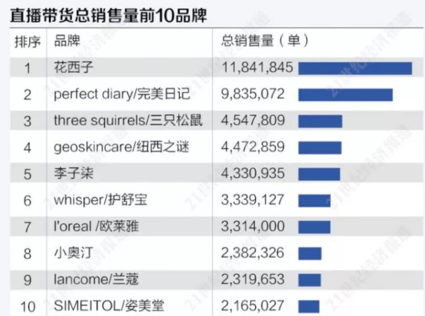 年报特别提及,与KOL的紧密合作,使得完美日记能够高效销售产品。根据南方财经发布的《2020年直播带货趋势报告——主播影响力排行榜Top100》显示,完美日记以全年984万单的总销量,位列直播带货品牌第二名。