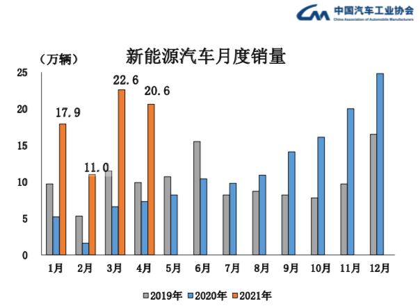 4月,新能源汽车产销分别达到21.6万辆和20.6万辆,产量环比增长0.1%,销量下降8.7%,同比增长1.6倍和1.8倍,与上年同期相比,纯电动和插电式混合动力汽车产销继续保持快速增长,其中纯电动汽车产销增速更为显著。
