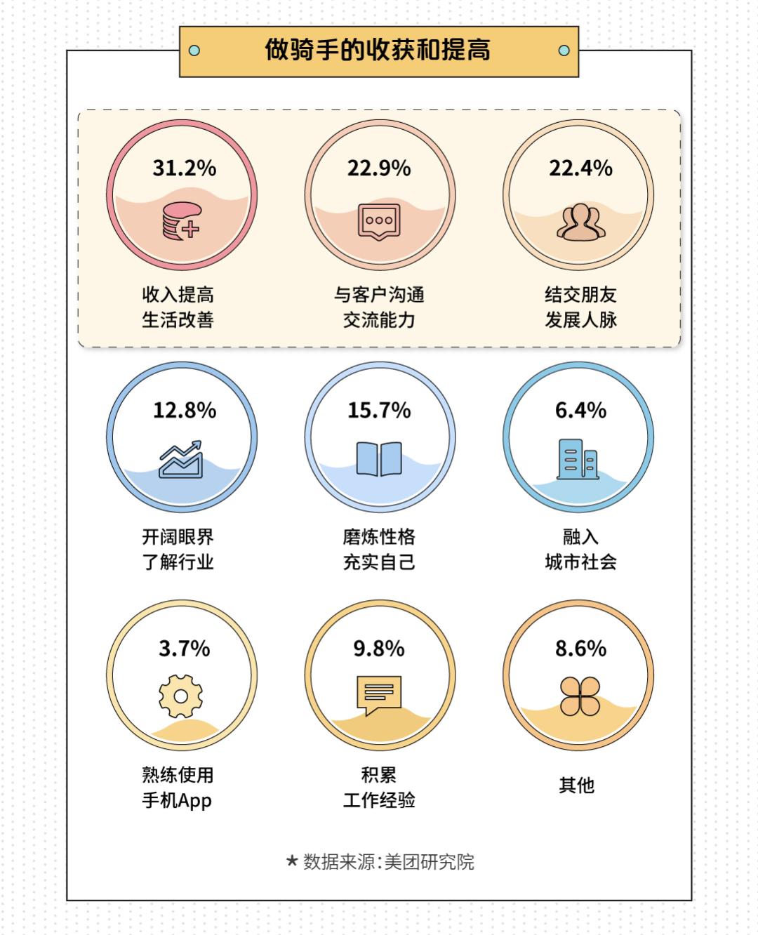 根据调研透露,外卖骑手在加入该行业后,得到明显提升排名第一的是“收入提高,生活改善”占 31.2%,但紧随其后的则是 22.9% 的人认为获得了“与客户沟通交流的能力”、22.4%的人因送外卖而“结交朋友,发展人脉”,还有 12.8% 的人认为通过外卖实现了“开阔眼界,了解行业”。