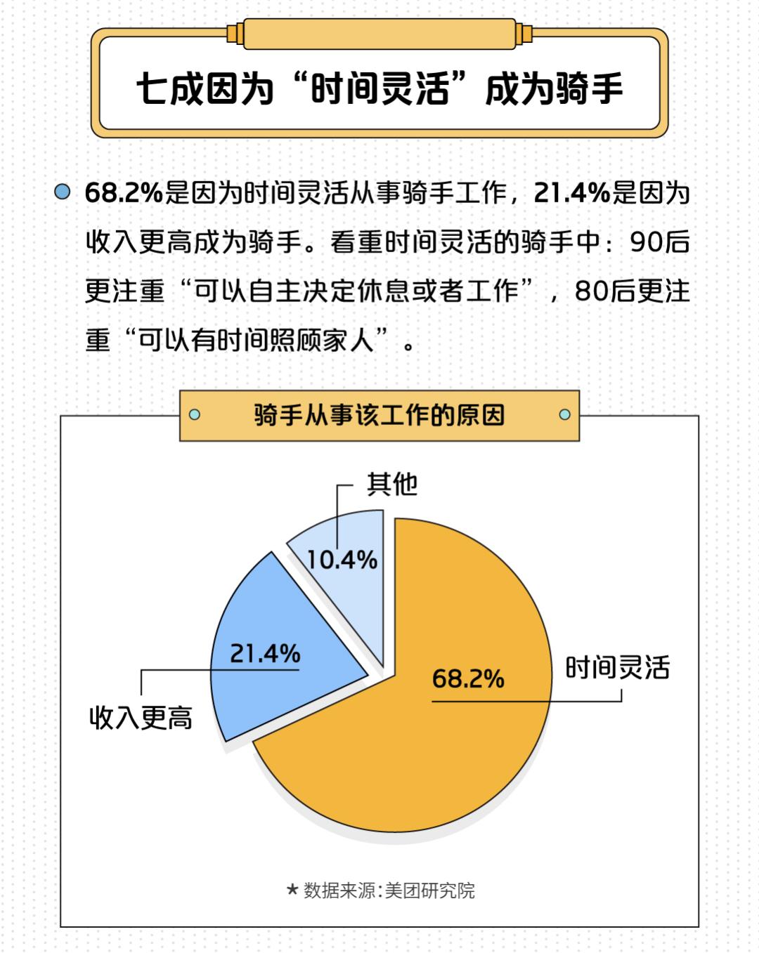 68.2% 的骑手是因为时间灵活选择了这份工作,而因为收入更高才选择这一行业的骑手仅为 21.4%。