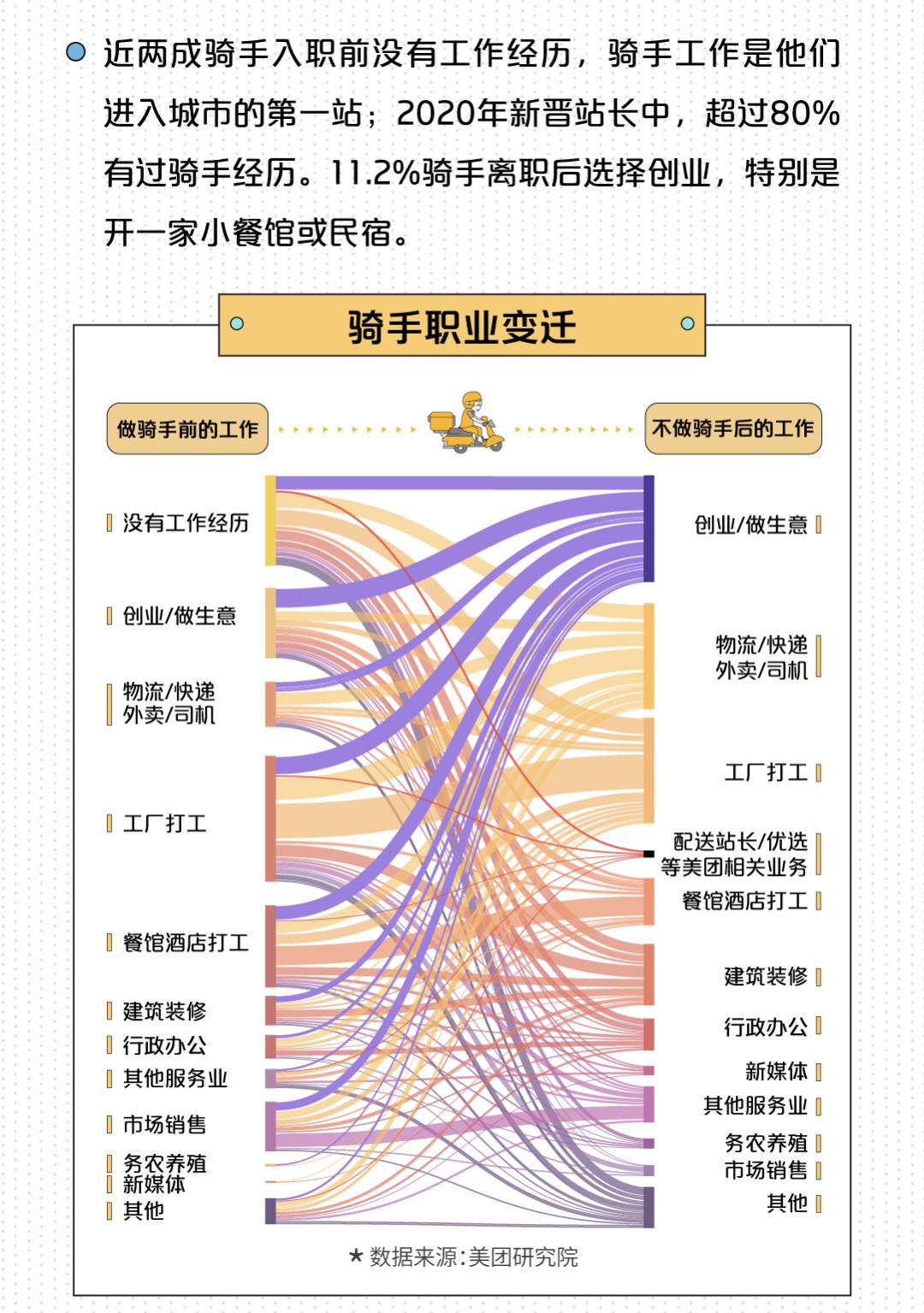 根据数据显示,有 24.8% 的骑手在入职前是“在工厂打工”,有 15.8% 的是在“餐馆酒店打工”。在离职后,除了回到工厂和去其它物流行业打工之外,有 11.2% 的人成功开办了属于自己的生意。