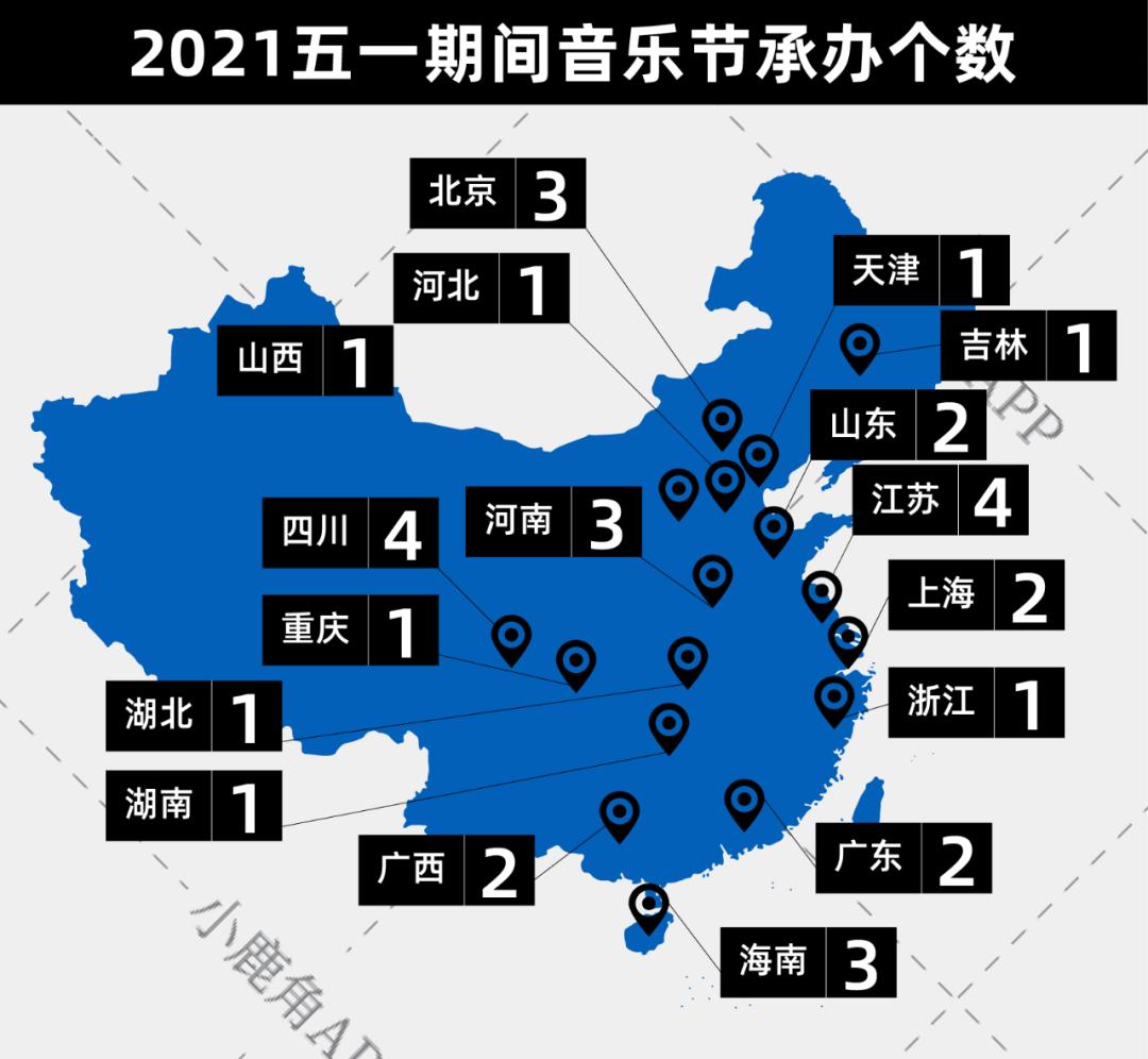 从地理分布上来看,五一假期的音乐节分布广泛北至长春,南至海南,部分热门城市还出现了举办多场音乐会的情况,比如成都除了2021成都战国迷笛音乐节,还有星巢秘境音乐节和CTV青白江国际音乐节。