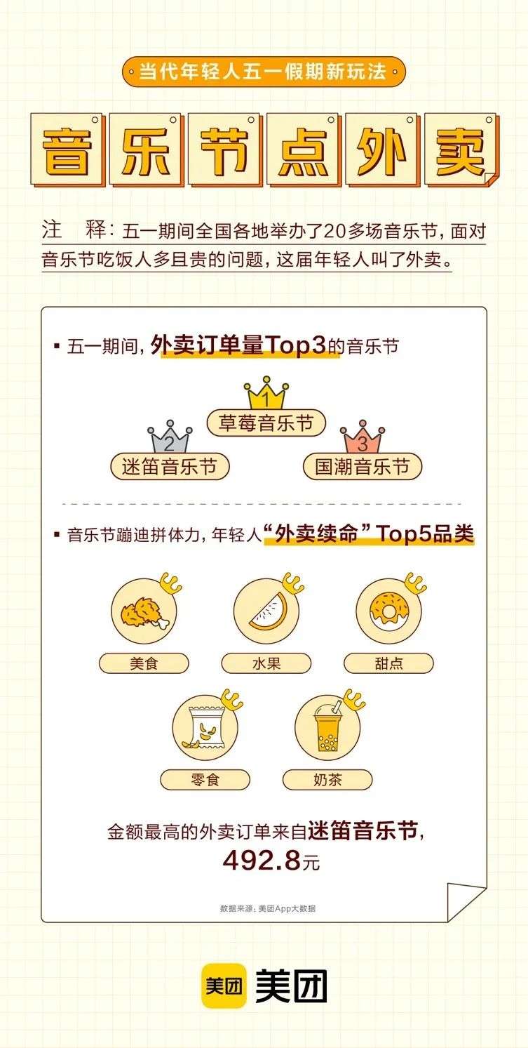 据美团App发布的五一假期消费相关数据显示,不少乐迷在音乐节的现场点起了外卖。其中,草莓音乐节、迷笛音乐节和国潮音乐节是五一期间外卖订单量最多的3个音乐节,而美食、水果、甜点、零食和奶茶分别占据外卖榜单的TOP5,而金额最高的外卖订单来自迷笛音乐节,达到492.8元。
