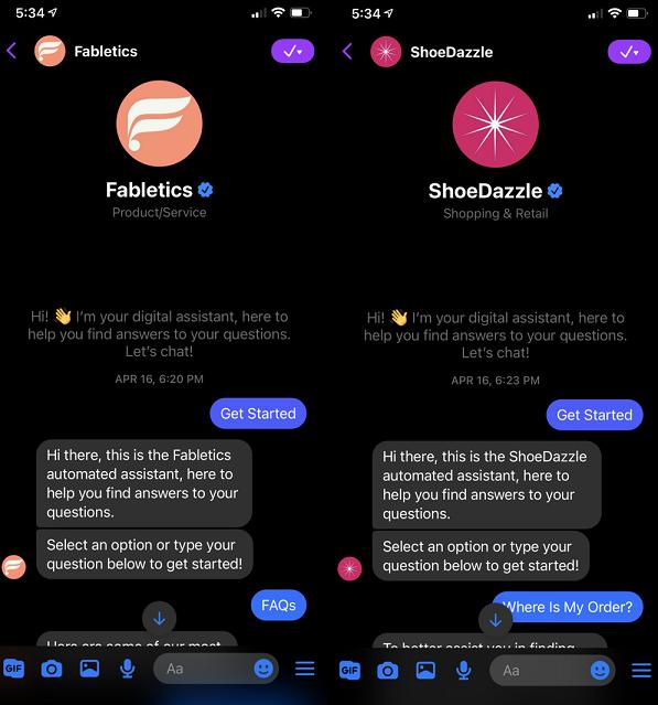 而正如上文说到的,Messenger 不止于售后客服,每一次互动都是品牌了解消费者需求、了解用户画像的机会。仍然以 TechStyle 旗下的金卡戴珊参与创立的女鞋品牌「ShoeDazzle」为例,开启对话之后,用户会面对几个标签,“FAQs”、“Where is My Order?”和“Ask me anything”。标签一的问题会引导用户了解品牌故事、查看品牌网站以及会员制度等,有些品牌还会在这类标签下为用户介绍新品。