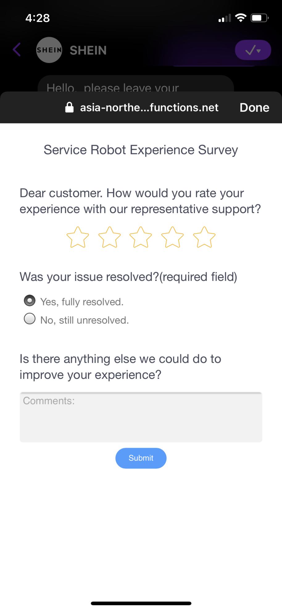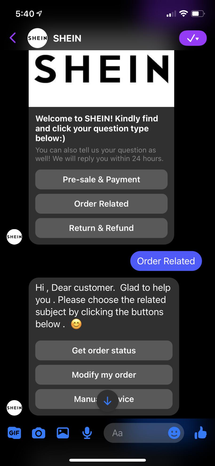笔者观察到的另一个 Messenger 客服做得十分专业的「SHEIN」,则会在用户结束客服之前向用户发送链接,邀请用户给互动体验打分、并对品牌优化提出建议。不过,「SHEIN」这样发送链接的方式,虽然不需要用户跳转界面,但还是不如在 Messenger 内完成打分方便。为用户打造无缝体验会让用户的参与度大大提升。