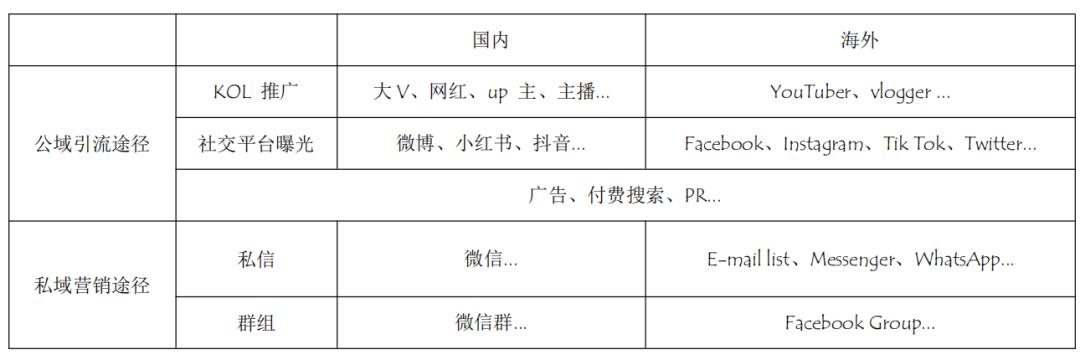 上表展示了国内与国外公域引流与私域沉淀用户的不同途径。邮件营销已经被越来越多的品牌重视起来,我们知道,大量的跨境商家,利用 WhatsApp 在上面做一些直接的售卖,但对于 Messenger 来说利用率并不高。