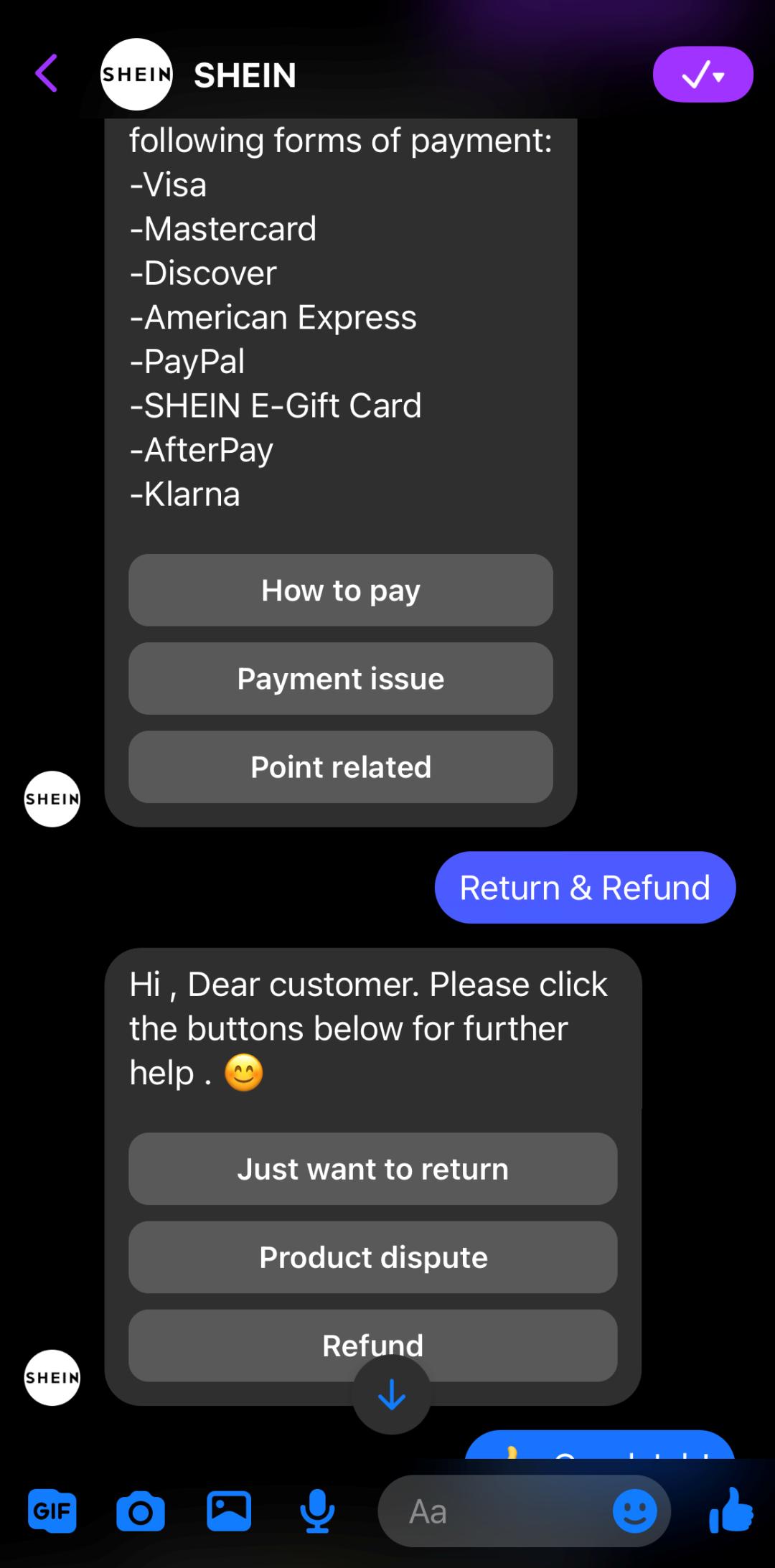 「SHEIN」做的最好的就是应答设置几乎能够覆盖用户想问的所有问题,涉及订单的物流、付款、退款、COVID-19 问题,涉及选品的产品信息、尺寸、新品推荐信息,分类十分明确。并且,客服的反应速度基本能保持在 10 秒内,让人有种被优待的感觉。