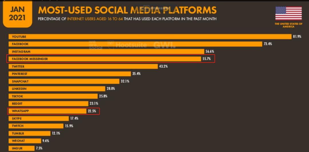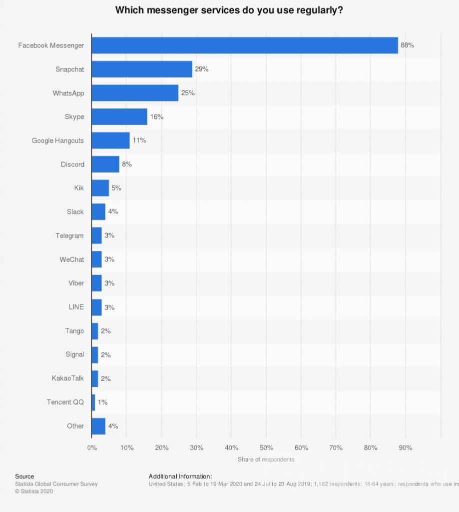 强调 Messenger 有 2 个原因:第一个原因是在成熟市场,如美国,根据 Statista 2020 年的调查,在美国 Messenger 渗透率远大于 WhatsApp。对于大多数出海的品牌而言,欧美成熟市场是高地,才能卖出溢价。