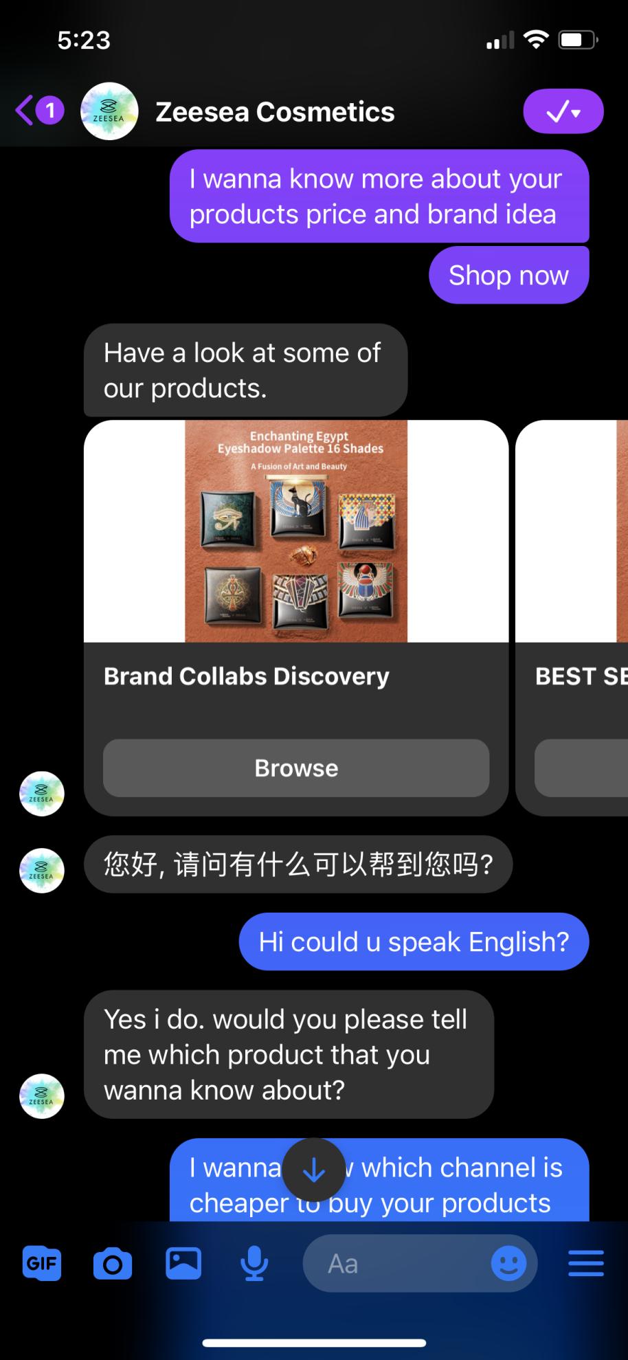 而「Zeesea」作为少数在欧美做得不错的国货彩妆品牌之一,Messenger 的客服服务让笔者再次确认,「Zeesea」在美国的成功不是偶然。笔者以 Facebook 的身份信息触发了人工客服,但没有用中文提问,当客服收到英文提问时,立刻从中文切换到英文,在回答笔者提问的同时推荐新品和销售渠道,看得出「Zeesea」的人工客服有较多的经验和应变能力。