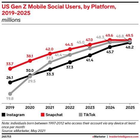 在此之前,白鲸出海也发布了《10 款 Z 世代 App 中,9 款都和它有关》的文章,分析了一些小众 App 借助于 Snapchat 工具包逐渐发展起来,包括最近的明星 App「Yubo」等等。而 eMarketer 的最新数据显示,TikTok 在未来几年很快就会追上前者。