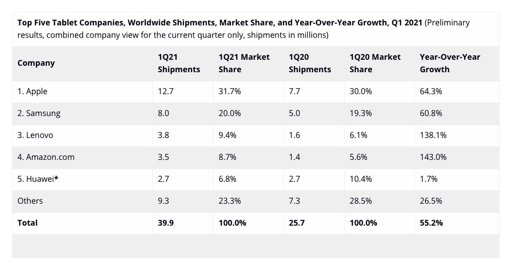 ▲2021 年第一季度平板电脑市场占比. 数据来源:IDC