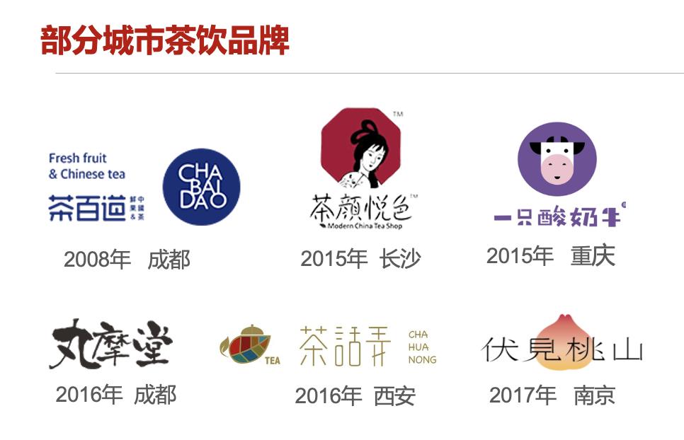 和喜茶、奈雪的茶、CoCO、一点点这些从一开始主要布局一二线的茶饮品牌不同,这些新一线成长的本地茶饮品牌,具有明显的局域发展成规模后才开始慢节奏的向外拓展。比如成都的茶百道、丸摩堂,长沙的茶颜悦色,西安的茶话弄,重庆的一只酸奶牛,以及南京的伏见桃山等。