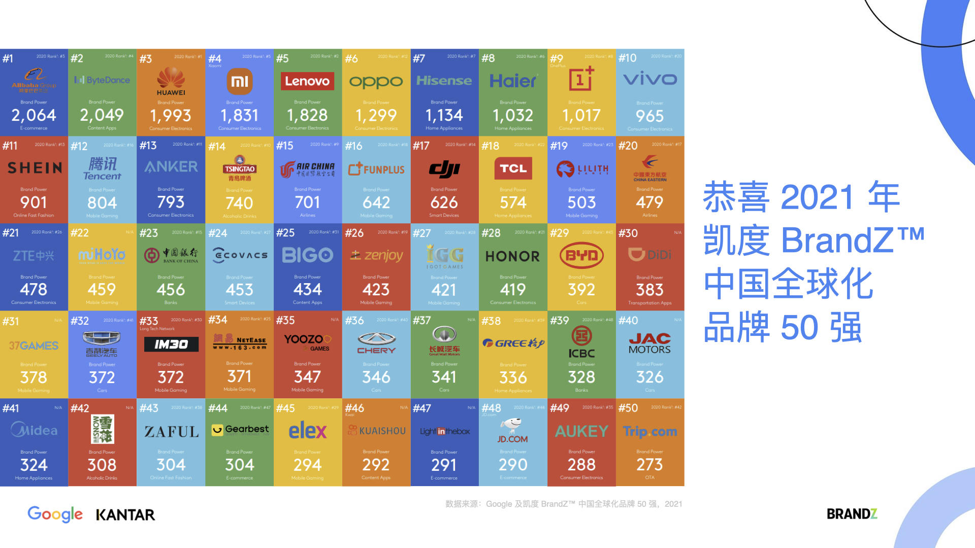 图片来源:谷歌 x 凯度《 2021 年凯度 BrandZ™ 中国全球化品牌 50 强》