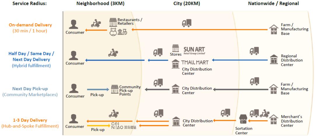 外卖及生鲜商品,30分钟至1小时内送达:盒马鲜生、饿了么(淘鲜达亦可能向这个方向扩张);