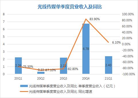 21年Q1随着疫情防控成效渐显,凭借一季度《人潮汹涌》等上映影片票房收入以及猫眼娱乐(一季度爆款影片《你好,李焕英》的保底发行方之一)的投资收益,光线传媒报告期内实现营收 2.4 亿元,同比增长 6.1%,归母净利润 1.98 亿元,同比增长 573.1%。