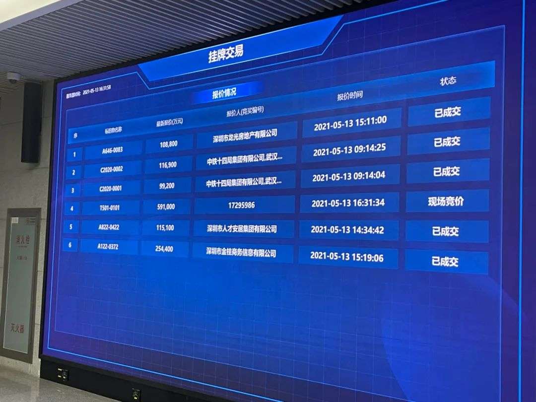开场,主持人宣布6宗地块中有3宗只有一人报名竞买,线上已成交,其中,深汕合作区两宗地块由中铁十四局+武汉交投,龙华民治地块由深圳人才安居集团竞得。