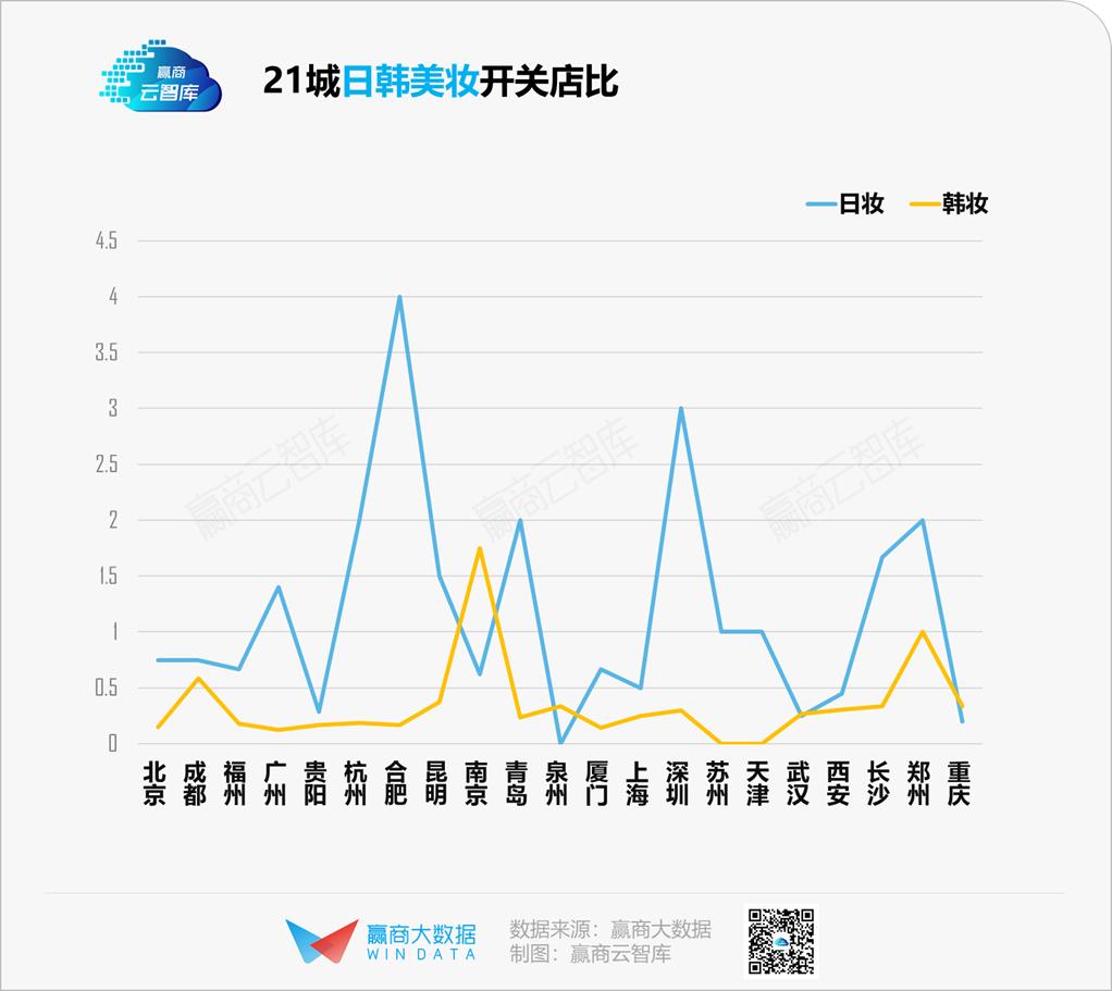 收缩战线的日韩美妆,在一线城市迎来大量关店潮。韩妆转而把门店选址调整在新一线城市,2020年,韩妆在南京、郑州两个新一线城市的开关门店比分别为1.75与1。