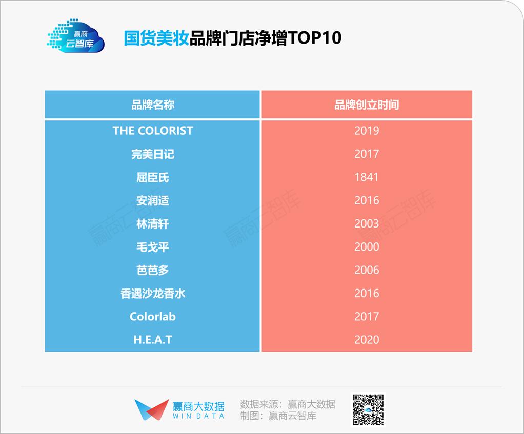 聚焦线下国货美妆,门店净增排行榜中,2016年后创立的品牌占比达60%以上,异军突起的新锐国货俨然成为美妆赛道的后起之秀。2020年完美日记上市成为“国货美妆第一股”,更是验证这一事实。