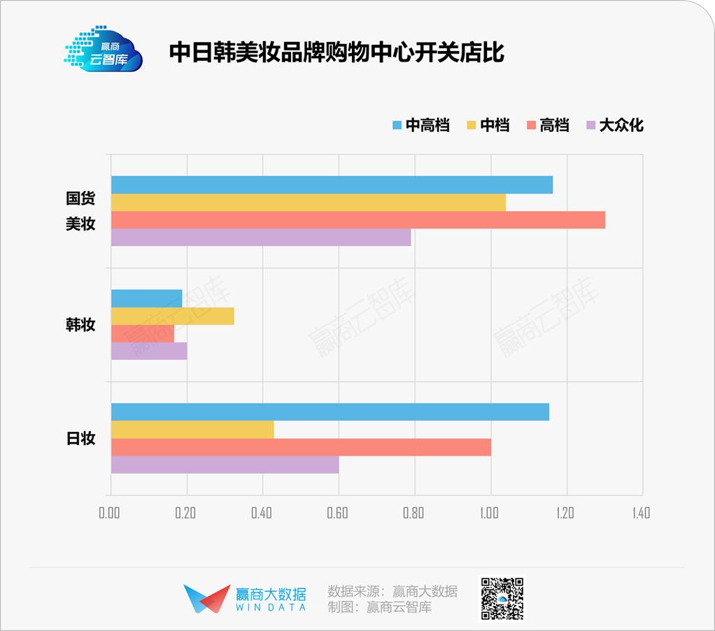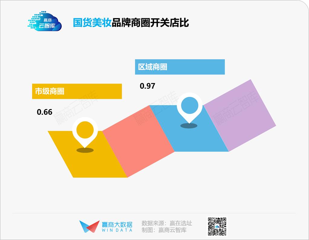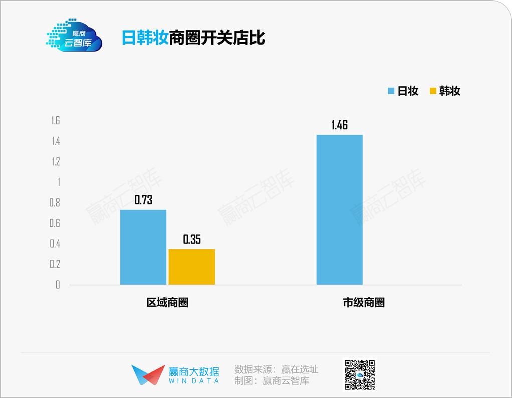 与国货美妆的门店战略有所不同,日韩美妆在门店布局分流奔走。日妆以1.46之高的开关店比进击市级商圈,而韩妆则全面撤退市级,专攻区域商圈。