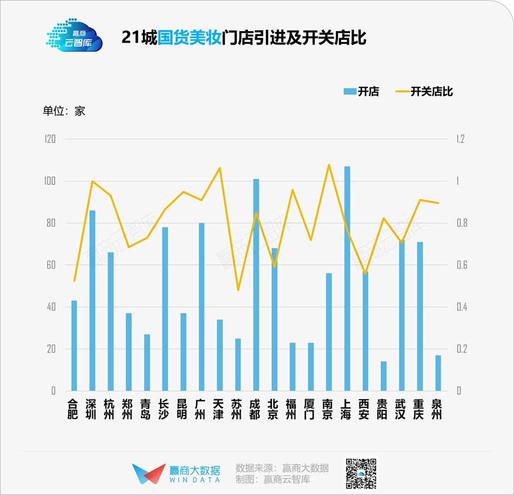 同样考虑关店增效的日妆品牌,虽在深圳的开关门店比达3,表现不俗,但新一线城市布局的脚步也在加快,日妆品牌在杭州、青岛、郑州开关门店比为2,扩张势头迅猛。