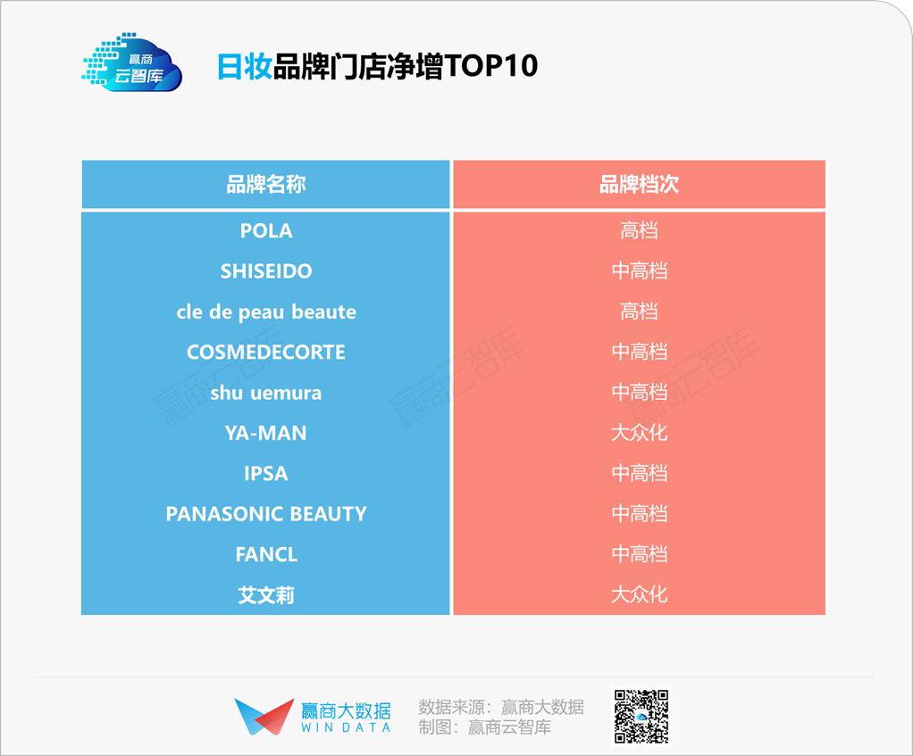 线下日妆门店表现,中高端品牌引人注意。门店净增TOP10中,CPB、IPSA、SHISEIDO均为资生堂旗下中高端品牌。