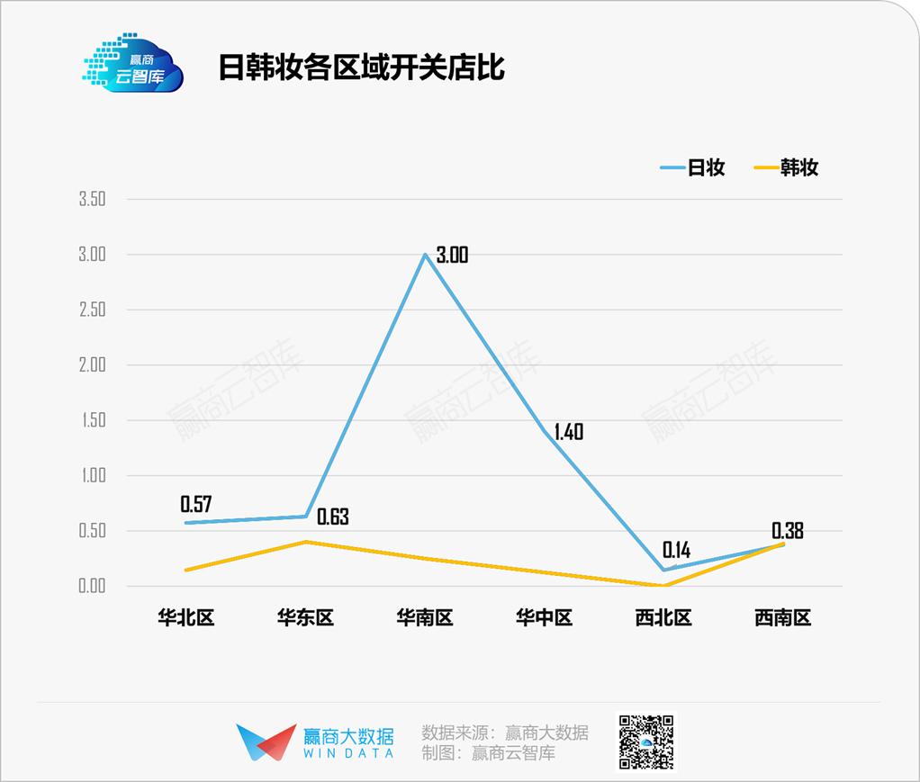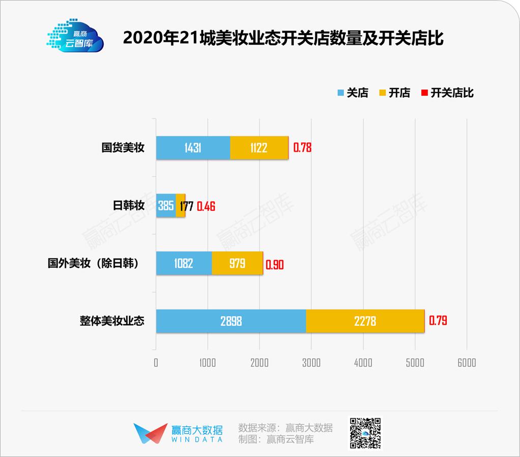 2020年,日韩美妆在中国市场关店近400家,开店仅170余家。其中,韩妆整体开关店比仅0.28,从区域表现来看,韩妆也全面陷入僵局。
