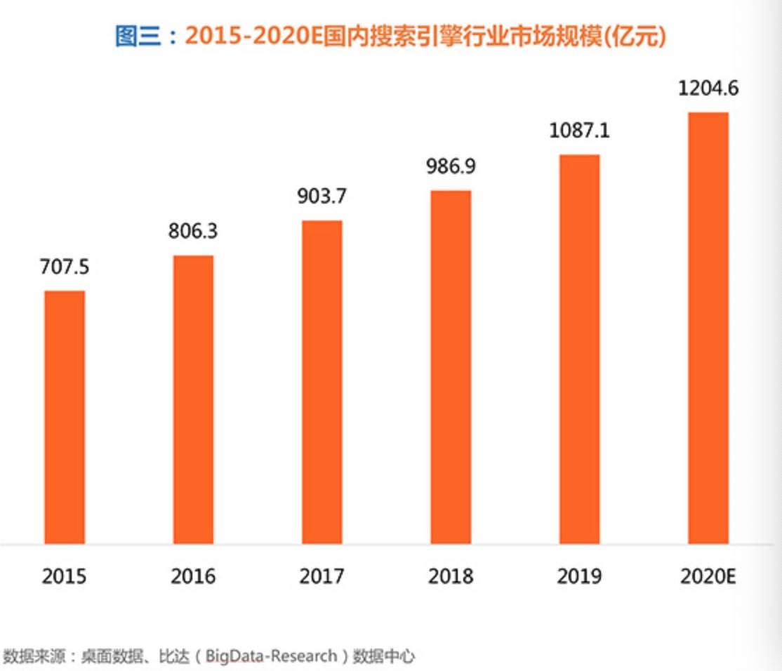 比达咨询的数据显示,2015至2020年,我国搜索引擎的市场规模从707亿元增长到了1200亿元,国内搜索引擎市场的年增长长期保持在10%左右,尤其是移动端的搜索。在国内搜索市场份额第一的百度在2010年推出移动端app,2014年百度app推出内容战略。抛开技术因素,今日头条布局移动搜索的时机与百度不分前后。