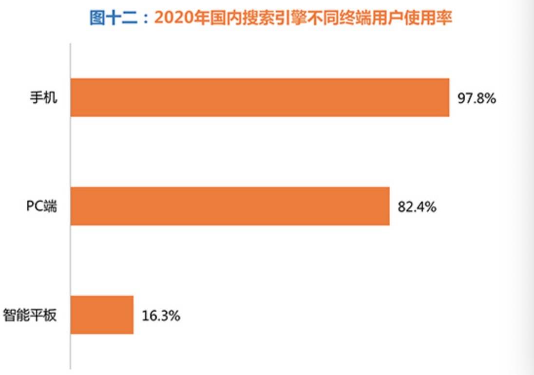 比达咨询发布的《国内搜索引擎发展市场报告》显示,2020年国内手机端搜索引擎的用户使用率达到98%,而PC端仅为82%。从最新的数据来看,用户在手机端的搜索使用率已经大大超过PC端,而随着用户对手机端app内搜索体验要求的提高,二者在未来的差距恐怕还会继续拉大。
