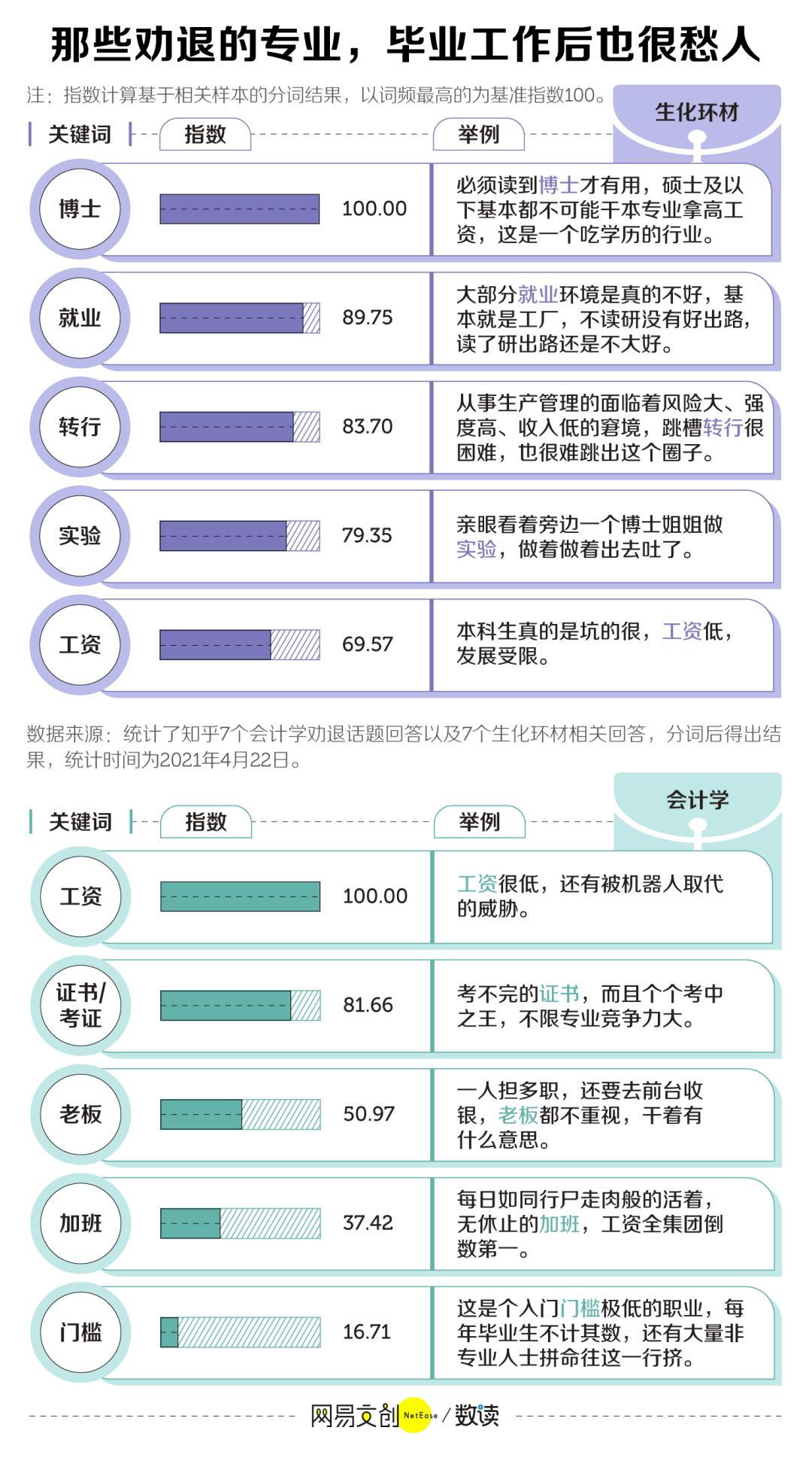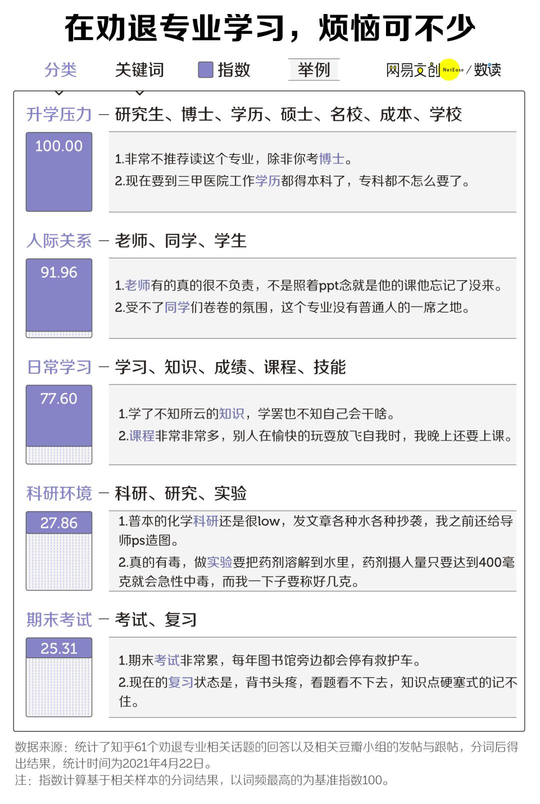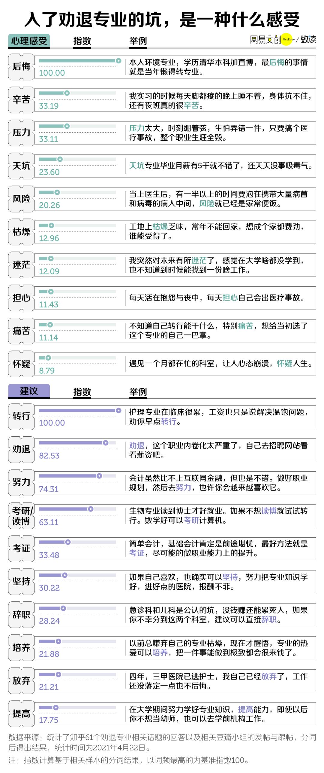 在这些直呼后悔,想要劝退别人的人中,也不乏当时填报志愿时功课没做充分的人。在填报志愿时多研究一下「劝退学」也是一件好事,毕竟劝退吐槽一时爽,盲选专业火葬场。