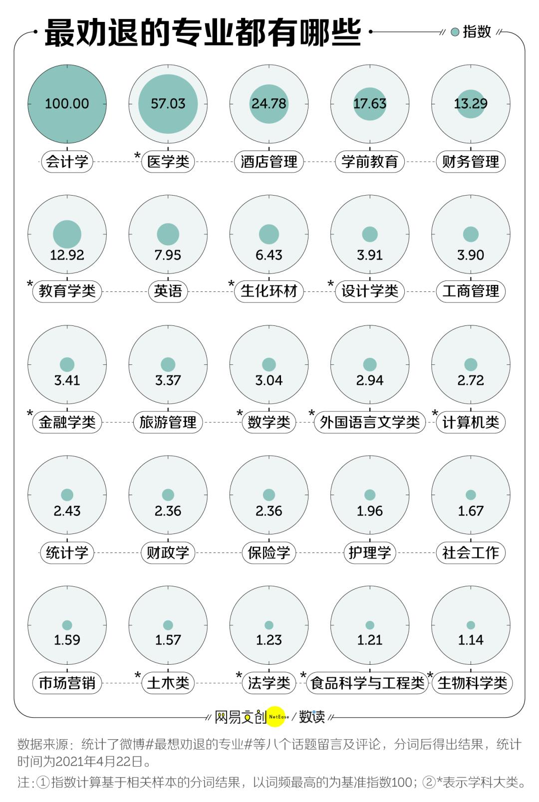 然而,在统计了微博上与“专业劝退”有关的话题后,我们发现,在会计学面前,医学和法学都得甘拜下风。在劝退专业的热度榜单中,会计学排名第一,看来“少壮不努力,长大学会计”才是大家公认的真理。