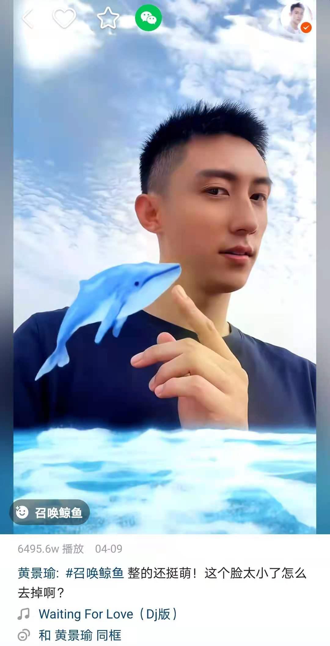 前段时间#黄景瑜北海追鲸鱼#登上热搜,4月初入驻快手的黄景瑜把在北海拍戏时的生活日常发到了平台上,鲸鱼虽然没等到,倒是带火了快手的召唤鲸鱼特效,单条视频播放量突破6000万。