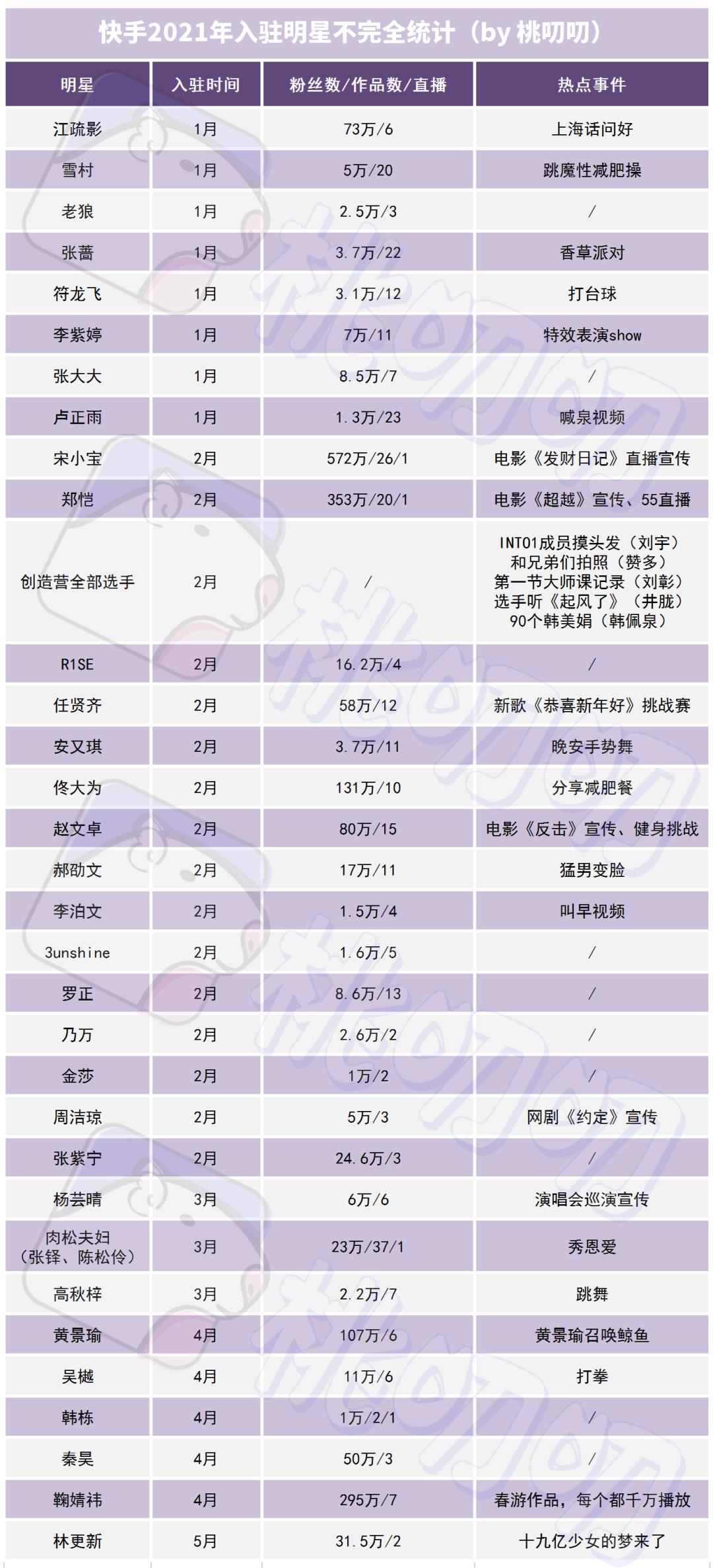 但今年截至5月,快手邀请入驻的明星多数已不是大牌艺人,而是人设更鲜明、在垂直领域拥有高粘性粉丝的圈层流量: