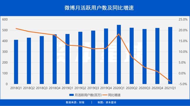 那个季度,微博月活用户净增8500万,规模达5.5亿,刷新公司历史新高。但在随后的几个季度里,微博月活用户数摸高下落。随着中国疫情迅速得到控制,户外活动逐渐恢复,微博的用户增速出现明显下滑。到了今年一季度,微博月活数量下降到5.3亿,同比下降近4%,日活数据同比也下降了5%。更加不乐观的是,过去三年里微博月活用户增速整体也呈震荡下滑趋势。