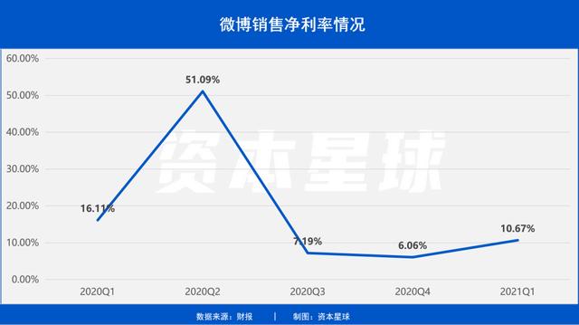 但是,与营收大涨形成鲜明对比的是,微博一季度净利润出现明显下跌,呈现“增收不增利”的态势。财报显示,2021年一季度微博归母净利润4982万元,较上年同期的5210万美元下降了4.39%。利润率方面,过去的三个季度微博净利润率较此前明显收窄。