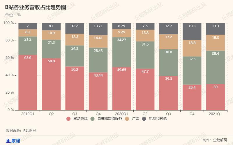 从各项营收占比来看,从去年第四季度开始,直播和增值服务就已经超过了移动游戏,成为B站最大业务模块,但二者相差不大,直播和增值服务仅领先3.1个百分点。