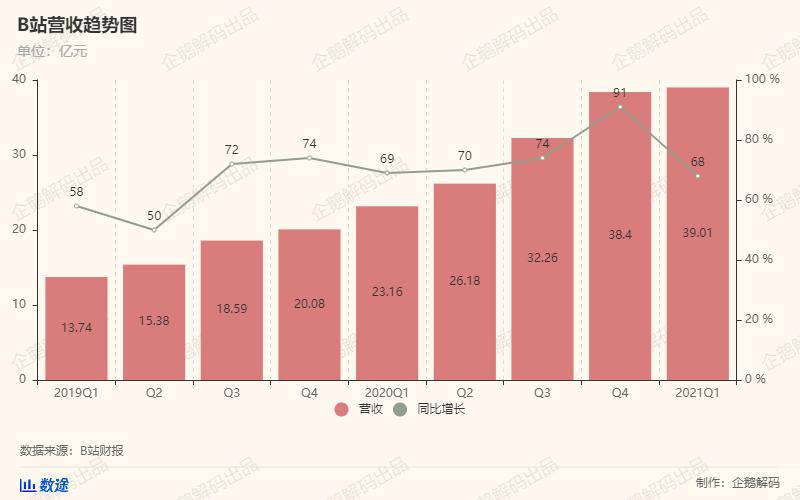 5月13日下午,B站发布了2021年的首个财报。财报显示,今年第一季度B站营收39.01亿元,同比增长68%,营收在超出预期的同时,还创下了历史新高;