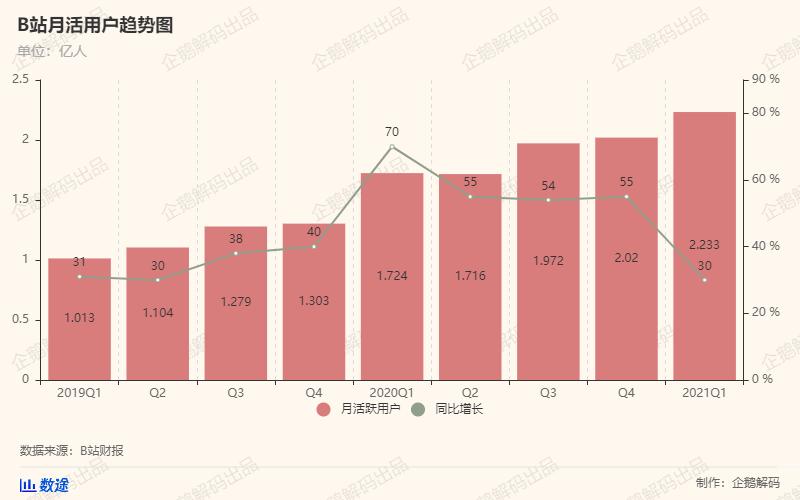 但B站需要注意,完成目标的前提是,随着用户数的逐渐增长,增速不能有太大的滑坡。过去三个三季度,B站月活用户增长分别为55%、54%、55%,但却在第一季度直接降到了30%,这或许是B站最该警惕的事情。