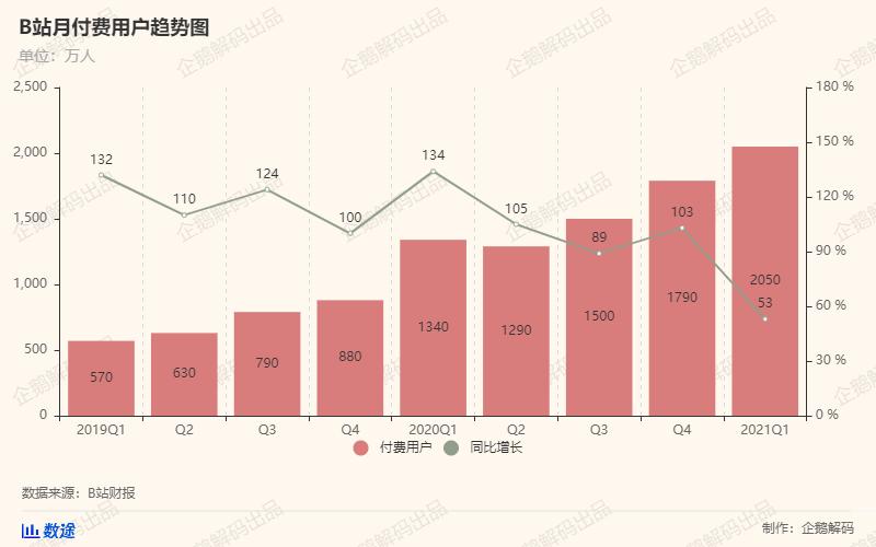 与月活用户数增长走势基本一致,B站月付费用户达到了2050万,同比增长53%,增速创下近两年来的新低。